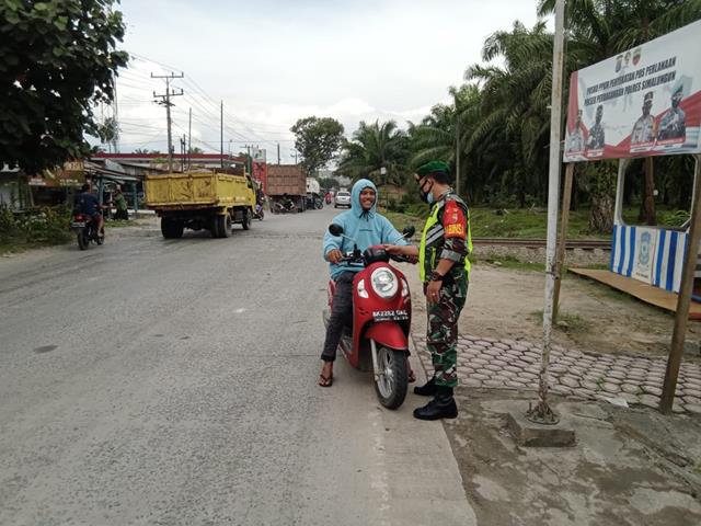 TNI selalu bersinergi dengan Kepolisian beserta instansi terkait lainnya secara rutin melakukan pendisiplinan penerapan protokol kesehatan Covid-19, seperti yang dilakukan oleh Babinsa Sertu M. Khumar Tarigan dan Serda J. Saragih dengan melakukan pemberlakuan pembatasan kegiatan masyarakat (PPKM) terhadap warga yang melintas di jalan raya. Babinsa yang secara langsung berbaur dengan masyarakat di wilayah binaan tentunya memiliki peran yang sangat penting dalam mengedukasi dan mengajak warga dalam mematuhi protokol kesehatan. Pendisiplinan protokol kesehatan terhadap warga di masa Pandemi Covid-19 menjadi salah satu fokus kegiatan Babinsa Sertu M. Khumar Tarigan dan Serda J. Saragih dalam melaksanakan tugas pokok di masing-masing wilayah.