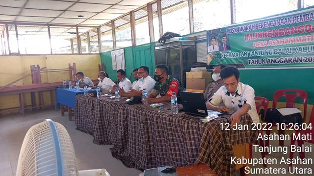 Pada kesempatan tersebut Babinsa saat menghadiri rapat musyawarah rencana pembangunan (Musrenbang) desa binaan yang berlangsung di Aula Desa Asahan Mati tersebut, Babinsa Sertu Suwardi mengungkapkan dengan kegiatan rapat Musyawarah tingkat Desa ini bertujuan saling bertukar pikiran dan berdiskusi membahas tentang usulan pembangunannya, dalam kegiatan tersebut Babinsa menyampaikan pesan-pesan kamtibmas kepada warga untuk mendukung dan mengawasi anggaran dana desa dalam pelaksanaan program pembangunan fasilitas desa. dan menghimbau kepada masyarakat untuk turut serta mensukseskan Pilkada Tahun 2022 dengan aman damai sejuk dan tetap mengedepankan protokol kesehatan, demi kesehatan dan keselamatan bersama.