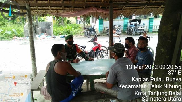 Tanjung Balai  |  Untuk mewujudkan kemanunggalan TNI dan Rakyat, upaya membangun Komunikasi Sosial (Komsos) dengan warga wilayah binaan terus dilakukan Babinsa, seperti yang dilakukan oleh Personel Bintara Pembina Desa (Babinsa) Koramil 08/Pulau Buaya jajaran Kodim 0208/Asahan Sertu HM Pasaribu turun kewilayah binaan untuk melaksanakan kegiatan Komunikasi Sosial (Komsos) bersama dengan Masyarakat yang berpropesi sebagai Nelayan, penarik Becak dan Buruh Bangunan untuk mendukung pelaksanaan Vaksin yang bermanfaat bagi kesehatan bersama, ini dilakukan bersama dengan Bapak Ihsan (Penarik Becak), Bapak Junaidi (Penarik Becak), Bapak Iskandar (Nelayan) dan Bapak Uli (Buruh Bangunan), kegiatan tersebut yang dilaksanakan bertempat di Jalan Sipori-pori Kelurahan Kapias Pulau Buaya Kecamatan Teluk Nibung Kota Tanjung Balai, Minggu (13/03/2022).