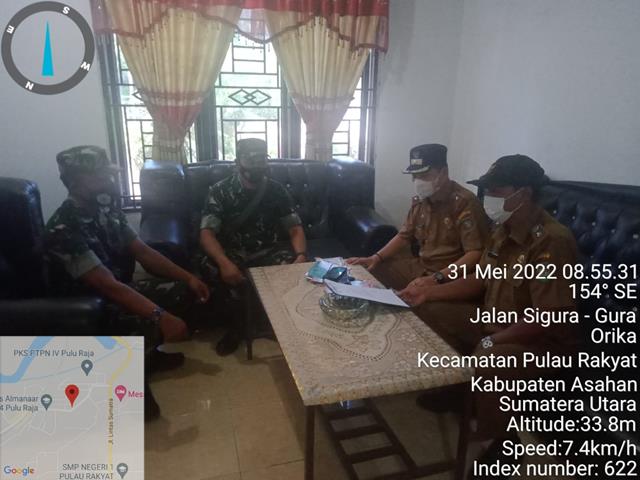 Asahan  |  Dalam rangka untuk menciptakan dan meningkatkan kerja sama yang baik dan menjaga silatuhrahmi  antara TNI-Polri dan Masyarakat serta untuk menciptakan kemanunggalan TNI dengan Rakyat, dalam hal ini seperti yang dilaksanakan oleh Personel Bintara Pembina Desa (Babinsa) Koramil 16/Pulau Rakyat jajaran Kodim 0208/Asahan Sertu M Mahdian dan 1 orang anggota Babinsa turun kewilayah biunaan untuk melaksanakan kegiatan Komunikasi Sosial (Komsos) bersama dengan Bapak Kepala Desa Desa Orika dan Kepala Desa Sei Piring dalam rangka untuk membahas keamanan Desa dan perkembangan menjelang akan di laksanakan Pil Kades bersama dengan Bapak Rusli (Kades Orika) dan Bapak Sabaruddin (Kades Sei Piring), kegiatan tersebut yang dilaksanakan bertempat di Kantor Desa Orika Dusun 1 Desa  Orika Kecamatan Pulau Rakyat Kabupaten Asahan, Selasa (31/05/2022).