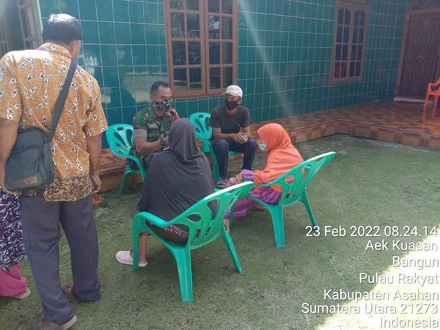 Asahan  |  Dalam rangka untuk menghimbau kepada warga untuk mendukung dan menyukseskan dengan segera mengikuti Vaksinasi Covid-19, seperti halnya yang dilakukan oleh Personel Bintara Pembina Desa (Babinsa) Koramil 16/Pulau Rakayat jajaran Kodim 0208/Asahan Serka Furnomo dan Koptu Hardianto turun kewilayah desa binaan untuk melaksanakan kegiatan Komunikasi Sosial (Komsos) bersama dengan warga binaan dalam rangka untuk mengajak Masyarakat Lansia untuk mau melaksanakan vaksin Dosis 2 dan Booster bersama dengan Bapak Wagino, Ibu Kartiem, Ibu Suminah dan Ibu Leginem, kegiatan tersebut yang dilaksanakan bertempat di Lingkungan 6 Kelurahan Aek Loba Pekan  Kecamatan Aek Kuasan Kabupaten Asahan, Rabu (23/02/2022).