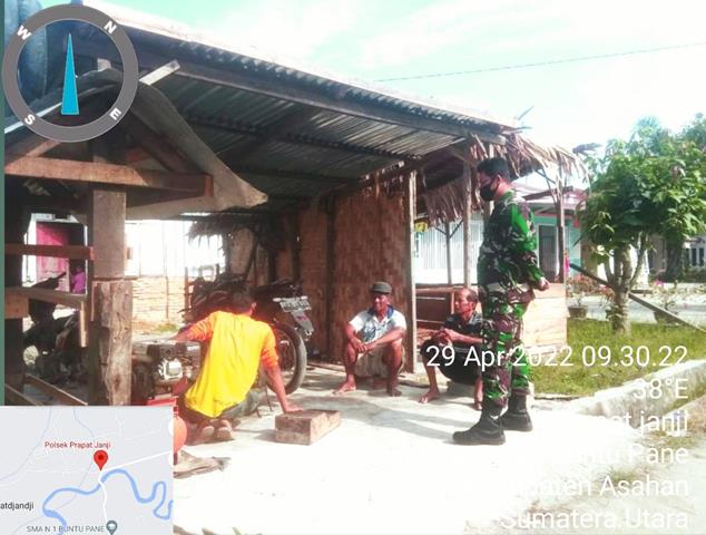 Asahan | Untuk menjalin keakraban dengam semua lapisan masyarakat, dalam hal ini seperti yang dilakukan oleh Personel Bintara Pembina Desa Koramil 13/Buntu Pane jajaran Kodim 0208/Asahan Serda Jasem turut serta melaksanakan Komunikasi Sosial (Komsos) dengan warga binaan dengan Warga Desa Binaan agar lebih waspada terhadap pencurian rumah yg sedang kosong karena di tinggal mudik menjelang lebaran Idul Fitri bersama dengan Kadus Dusun 3 (Bapak Syarul), Tokoh masyarakat (Bapak Yetno) dan Tokoh Pemuda (Bapak Frans), sekaligus menghimbau untuk selalu mematuhi Prokes dalam rangka meminimalisir Penyebaran Pandemi Covid-19 serta membicarakan tentang Keamanan Kampung, masyarakat agar ikut mensosialisasikan kebersihan lingkungan agar terhindar dari penyakit menular, kegiatan tersebut yang dilaksanakan bertempat di Dusun 3 Desa Prapat Janji Kecamatan Buntu Pane Kabupaten Asahan, Jumat (29/04/2022).