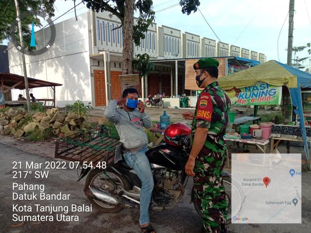 Tanjung Balai | Guna untuk memutus mata rantai penyebaran Virus Covid 19 di wilayah Binaan, dalam hal ini seperti yang dilakukan oleh Personel Bintara Pembina Desa (Babinsa) Koramil 17/Datuk Bandar jajaran Kodim 0208/Asahan Kopda Wirton H Tamba turun kewilayah binaan untuk melaksanakan pengawasan protokol covid-19 kepada masyarakat dengan memberikan pemahaman New Normal yaitu menggunakan masker setiap keluar rumah,cuci tangan pakai sabun dan menjaga jarak dan bagikan masker, kegiatan tersebut yang dilaksanakanbertempat di Jalan HM. Nur Lingkungan IV Kelurahan Pahang Kecamatan Datuk Bandar Kota Tanjung Balai, Senin (21/03/2022).