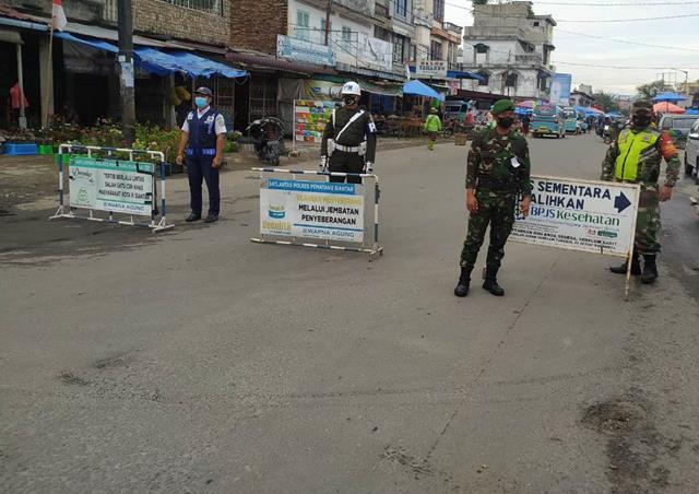 Laksanakan Ops Penyekatan PPKM Level lV Di Pasar Dwi Kora Dilakukan Personel Jajaran Kodim 0207/Simalungun
