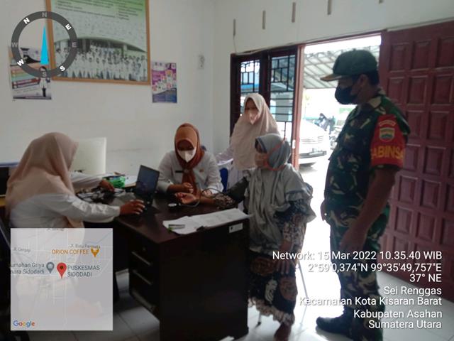 Asahan | Pengamanan kegiatan pemberian vaksin tahap pertama dan kedua untuk masyarakat ini, untuk memberikan rasa aman dan nyaman kepada warga masyarakat agar tidak takut dalam menerima suntik vaksin covid-19 tahap pertama sekaligus monitoring kegiatan tersebut, dalam hal ini seperti yangdilakukan oleh Personel Bintara Pembina Desa (Babinsa) Koramil 06/Kisaran jajaran Kodim 0208/Asahan Serda Kamaluddin turun kewilayah binaan untuk melaskanakan kegiatan Pendampingan Vaksinasi Dosis 1, 2 dan 3 bersama dengan Kasat Narkoba (AKP Nasrin Ginting), Babinsa Koramil 06/Kisaran, Nakes Puskesmas Sidodadi dan Peserta vaksin, kegiatanm tersebut yang dilaksanakan bertempat di Puskesmas Sidodadi Jalan Ir. Sutami Kelurahan Seirenggas Kecamatan Kisaran Kabupaten Asahan, Selasa (15/03/2022).