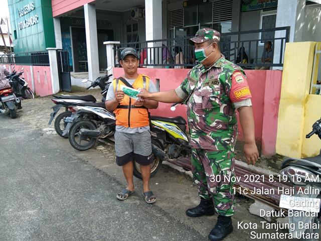 Guna untuk memutus mata rantai penyebaran Virus Covid 19 di wilayah Binaan, dalam hal ini Personel Bintara Pembina Desa (Babinsa) Koramil 17/Datuk Bandar jajaran Kodim 0208/Asahan Pelda Herianto turun kewilayah binaan untuk melaksanakan kegiatan pengawasan protokol covid-19 kepada masyarakat dengan memberikan pemahaman New Normal yaitu menggunakan masker setiap keluar rumah,cuci tangan pakai sabun, menjaga jarak dan membagikan masker, kegiatan tersebut yang dilaksanakan bertempat di Jalan H. Adlin Lingkungan V Kelurahan Gading Kecamatan Datuk Bandar Kota Tanjung Balai, Selasa (30/11/2021).