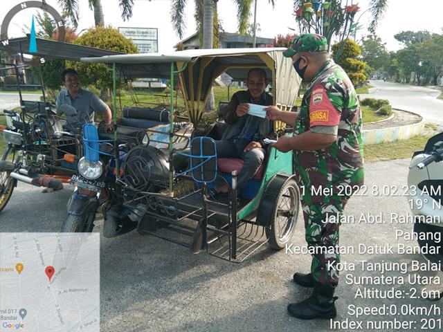 Tanjung Balai | Guna untuk memutus mata rantai penyebaran Virus Covid 19 di wilayah Binaan, seperti halnya yang dilakukan oleh Personel Bintara Pembina Desa (Babinsa) Koramil 17/Datuk Bandar jajaran Kodim 0208/Asahan Pelda Herianto turun kewilayah binaan untuk melaksanakan kegiatan pengawasan protokol Covid-19 kepada masyarakat dengan memberikan pemahaman New Normal yaitu menggunakan masker setiap keluar rumah, cuci tangan pakai sabun, menjaga jarak dan membagikan masker, kegiatan tersebut yang dilaskanakan bertempat di Jalan Andulrahman Kelurahan Pahang Kecamatan Datuk Bandar Kota Tanjung Balai, Minggu (01/05/2022).
