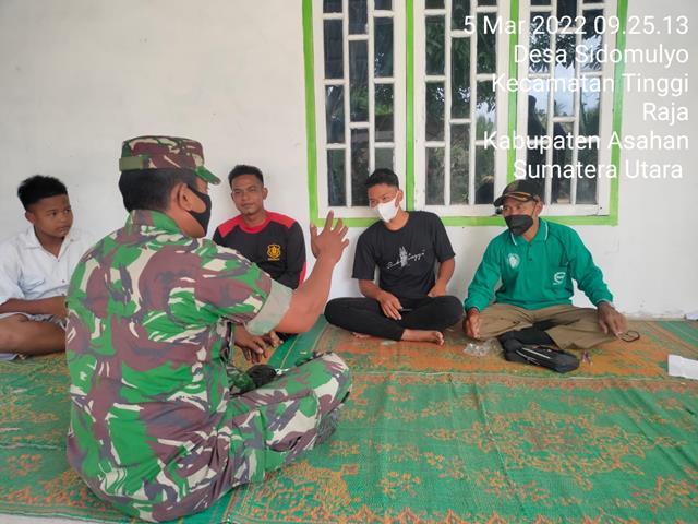 Asahan | Salah satu tujuan komunikasi sosial adalah terbentuknya suatu aktualisasi diri pribadi, stabilitas sosial, tertib sosial, penerusan nilai-nilai lama dan baru di masyarakat sehingga dapat memupuk, membina dan memperluas kesadaran masyarakat, seperti yang dilakukan oleh Personel Bintara Pembina Desa (Babinsa) Koramil 13/Buntu Pane jajaran Kodim 0208/Asahan Serda Andarin turun kewilayah binaan untuk melaksanakan kegiatan Komunikasi Sosial (Komsos) bersama dengan kepada para pemuda dan pemudi dalam rangka memberikan Wawasan kebangsaan untuk mencintai tanah air Indonesia, kegiatan in juga turut serta dihadiri oleh Waka Polsek Prapat Janji Iptu Ps. Pane dan Tokoh Pemuda Desa Sidomulyo a.n. Wandi, kegiatan tersebut yang dilaksanakan bertempat di wilayah Desa Binaan di Dusun II Buntu Pagar Desa Sidomulyo Kecamatan Tinggi Raja Kabupaten Asahan, Sabtu (05/03/2022).