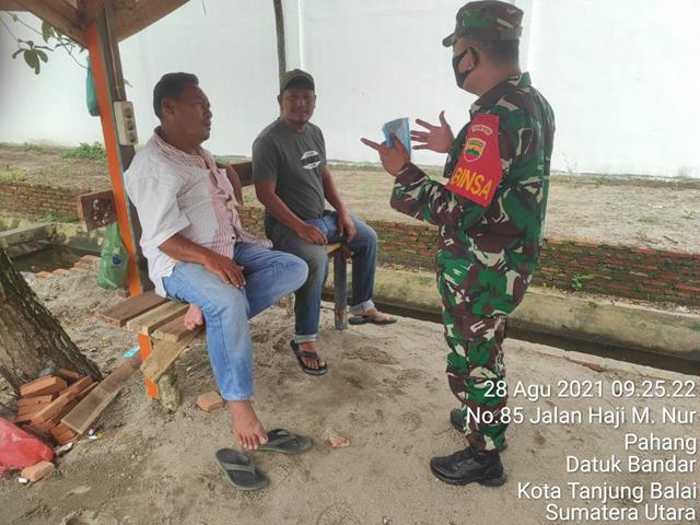 Tanjung Balai | Guna untuk memutus mata rantai penyebaran Virus Covid 19 di wilayah Binaan, upaya mempercepat pemutusan rantai penyebaran Covid-19, maka dari itu Personel Bintara Pembina Desa (Babinsa) Koramil 17/Datuk Bandar jajaran Kodim 0208/Asahan Serka I.K Siahaan turun kewilayah binaan untuk melaksanakan kegiatan GAKPLIN (Penegakan Disiplin) Protokol Kesehatan kepada masyarakat dengan memberikan pemahaman New Normal yaitu menggunakan masker setiap keluar rumah,cuci tangan pakai sabun, menjaga jarak dan membagikan masker, kegiatan tersebut yang dilaksanakan bertempat di Jalan Haji M. Nur Kelurahan Pahang Kecamatan Datuk Bandar Kota Tanjung Balai, Sabtu (28/08/2021).