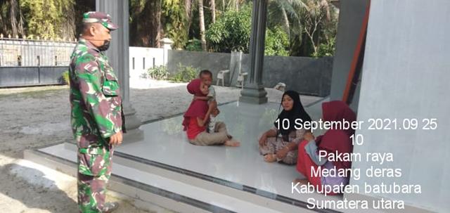 Batu Bara  |  Terjalinnya hubungan tali silaturrahmi yang harmonis antara Babinsa dengan warga Masyarakat melalui Komunikasi Sosial Babinsa lebih dekat dengan warga Masyarakat di wilayah binaan, seprti halnya yang dilakkukan oleh Personel Bintara Pembina Desa (Babinsa) Koramil 01/Medang Deras jajaran Kodim 0208/Asahan Serma Nelson Gogerino turun kewilayah binaan untuk turut serta melaksanakan kegiatan Komunikasi Sosial (Kosmsos) bersama masyarakat Desa binaan dalam rangka agar  selalu menghimbau masyarakat tetap menjaga protokol kesehatan bersama dengan Ibuk Sutini, Ibuk Poniyem dan Ibuk Tari, kegiatan tersebut yang dilaksanakan bertempat di Desa Pakam Raya Kecamatan Medang Deras Kabupaten Batu Bara, Jumat (10/09/2021).