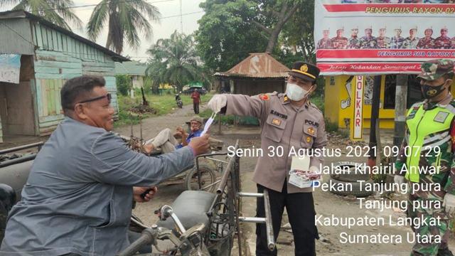 Tanjung Pura –   Sinergi  Timsatgas Covid 19 melakukan penegakkan PPKM level 3  cegah penyebaran covid -19,  untuk itu Babinsa Koramil 11/Tanjung Pura kodim 0203/Langkat Serda Kusno Sujarwadi bersama anggota Polsek melaksanakan kegiatan himbauan Penegakan disiplin protokol kesehatan pembagian masker bagi pengguna jalan bertempat di Jalan Khairil Anwar Kelurahan Pekan Kecamatan Tanjung Pura Kabupaten Langkat, Selasa ( 31/08/2021).