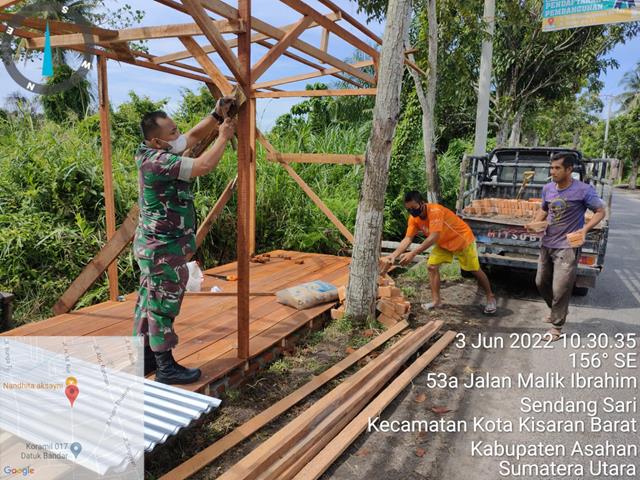Tanjung Balai | Dalam rangka agar terjalinnya hubungan dan Komunikasi yang baik antara Babinsa dengan masyarakat Desa serta agar terjalinnya hubungan yang baik antara Babinsa dan masyarakat binaan. Dalam hal ini seperti halnya yang dilakukan oleh Personel Bintara Pembina Desa (Babinsa) Koramil 17/Datuk Bandar jajaran Kodim 0208/Asahan Pelda JS Manik turun kewilayah binaan untuk melaksanakan kegiatan Komunikasi Sosial (Komsos) dalam rangka untuk membantu masyrakat membuat kios ibu Sarifah untuk digunakan jual lontong dan Nasi lemak bersama dengan Bapak Soleh, Bapak Zulkarnaen, Bapak Andi dan Bapak Samiun, kegiatan tersebut yang dilaksanakan bertempat di Jalan M Nur Lingkungan l Kelurahan Pahang Kecamatan Datuk Bandar Kota Tanjung Balai, Jumat (03/06/2022).