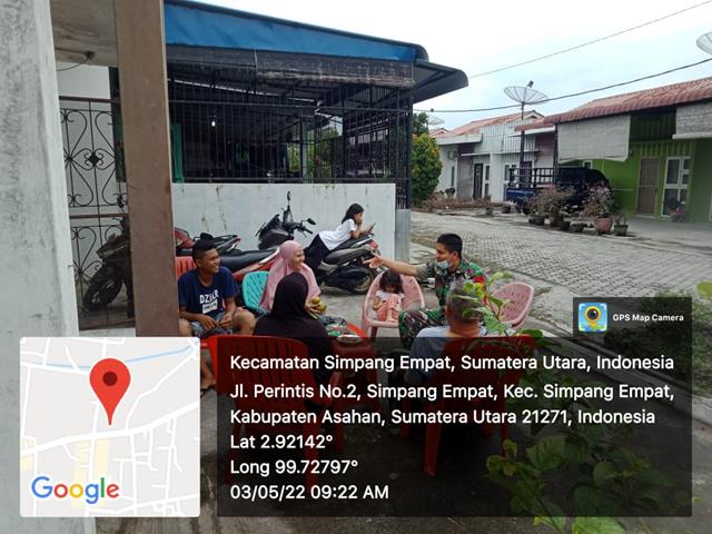 Asahan  |  dengan adanya Komunikasi Sosial (Komsos) bersama warga, dapat menumbuhkan kedekatan hubungan kekeluargaan antara TNI dan rakyat tetap terjaga dengan baik, dalam hal ini seperti yang dilakukan oleh Personel Bintara Pembiona Desa (Babinsa) Koramil 11/Simapng Empat jajaran Kodim 0208/Asahan Serka Adi S Sirait turun kewilayah binaan untuk melaksanakan kegiatan Komunikasi Sosial (Komsos) serta melaksanakan silahturami kerumah Bapak Acir dalam rangka hari raya idul fitri bersama dengan Bapak Acir, Ibu Ciah dan Ibu Diana, kegiatan tersebut yang dilaksanakan betempat di Dusun 19 Desa Simpang Empat Kecamatan Simpang Empat Kabupaten Asahan, Selasa (03/05/2022).