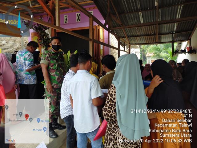 Batu Bara  |  Dalam rangka untuk menciptakan dan meningkatkan kerja sama yang baik, dan menjaga silatuhrahmi antara Babinsa dan aparatur desa dan Masyarakat serta kemanunggalan TNI dan Rakyat. Kegiatan sekecil apa pun di wilayah teritorial Kodim 0208/Asahan, Babinsa selalu hadir mendampingi, hal ini untuk selalu memberikan rasa aman dan nyaman kepada warga masyarakat binaan, dalamhal ini seperti yang dilakukan oleh Personel Bintara Pembina Desa (Babinsa) Koramil 04/Talawi jajaran Kodim 0208/Asahan Serma Indra K dan Serda Dhani M turun kewilayah desa binaan untuk melaksanakan kegiatan pendampingan dan monitoring dalam kegiatan penyaluran Bantuan Langsung Tunai Minyak Goreng dalam rangka pembagian BLT minyak goreng Desa Dahari selebar 459 KK, kegiatan tersebut yang dilaksanakan bertempat di Desa Dahari Selebar Kecamatan Talawi Kabupaten Batu Bara, Rabu (20/04/2022).