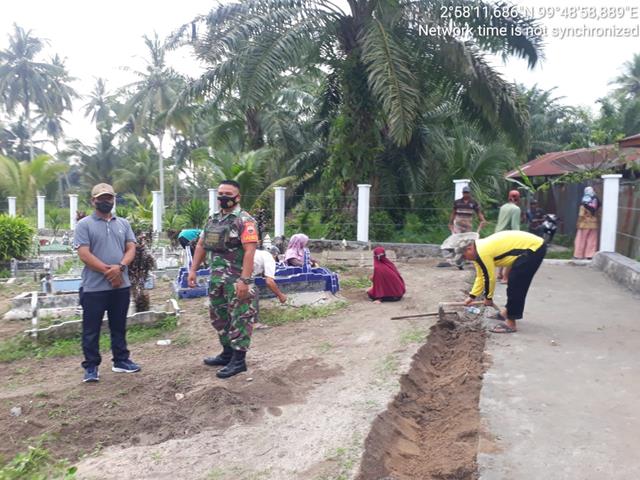 Dalam kesempatan ini Babinsa Serda Yuspa K bersama warga melaksanakan kerja bakti pembersihan Tempat Pemakaman Umum (TPU) di desa binaan dengan sasaran kerja bakti kali ini adalah pembersihan semak, rumput dan sampah di area pemakaman. “Kegiatan kerja bakti pembersihan makam tersebut dalam rangka membersihkan makam leluhur, agar terlihat rapi dan bersih dari rumput,” kata Serda Yuspa K.