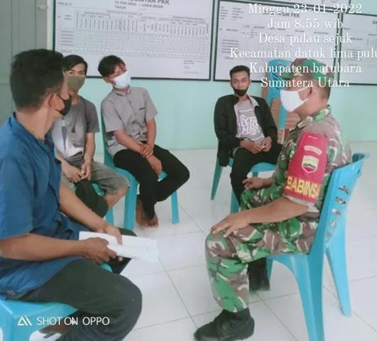 Batu Bara  |  alam rangka meningkatkan kerja sama yang baik dalam mendukung tugas pokoknya sebagai Bintara Pembina Desa, seperti halnya yang dilakukan oleh Personel Bintara Pembina Desa (Babinsa) Koramil 03/Lima Puluh jajaranKodim 0208/Asahan Sertu Indra Sakti turun kewilayah binaan untuk melaksanakan kegiatan Komunikasi Sosial (Komsos) bersama dengan Perangkat desa pulau sejuk, dalam rangka membahas masalah vaksinasi agar para kadus mengecek dan mendata ulang warga yang sudah/belum vaksin serta mengajak warganya agar melaksanakan vaksin guna mendukung program pemerintah bersama dengan Kades Pulau Sejuk Bapak Siswanto SI.P, Kadus 1 Bapak Sarwi, Kadus 2 Bapak Umar dan Kadus 3 Bapak Juri, kegiatan tersebut yang dilaksanakan bertempat di Desa Pulau Sejuk Kecamatan Datuk Lima Puluh Kabupaten Batu Bara, Minggu (23/01/2022).