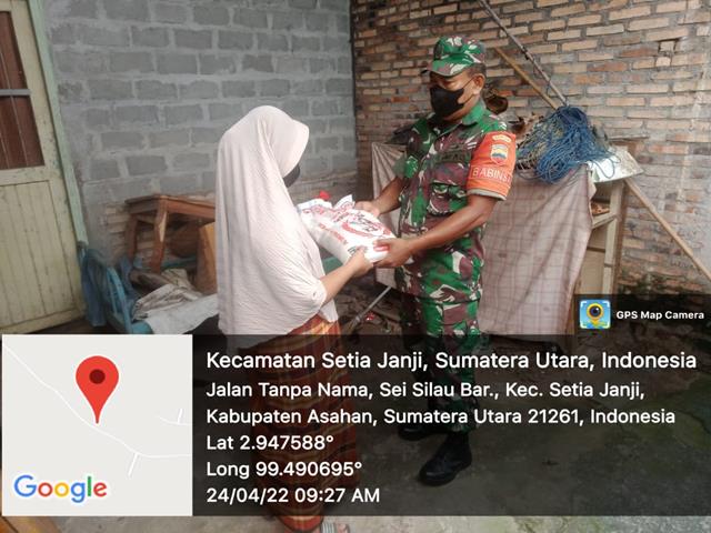 Asahan | Kegiatan Baksos ini sebagai bentuk kepedulian terhadap sesama di masa pandemi, membagikan sembako kami bagikan kepada warga masyarakat yang terdampak Covid-19 dan warga yang kurang mampu, dalam hal ini seperti yang dilakukan oleh Personel Bintara Pembina Desa (Babinsa) Koramil 13/Buntu Pane jajaran Kodim 0208/Asahan Sertu Nurfadli turun kewilayah binaan untuk melaksanakan kegiatan Pemberian Sembako berupa satu karung beras kepada Ibu Sulastri warga Desa binaan yang kurang mampu agar bisa sama-sama menikmati saat Ramadhan dan menyambut Idul Fitri nantinya, kegiatan tersebut yang dilaksanakan bertempat di Dusun IV Desa Sei Silau Barat Kecamatan Setia Janji Kabupaten Asahan, Minggu (24/04/2022).