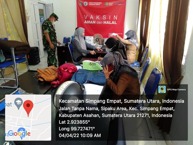 Asahan | Selalu melaksanakan pendampingan dan pemantauan dalam setiap kegiatan vaksinasi. Untuk mengantisipasi segala kemungkinan yang terjadi sehingga bila ada hal-hal menonjol, Babinsa dan unsur terkait bisa segera memberikan tindakan dengan cepat, dalam hal ini seperti yang dilakukan oleh Komandan Koramil (Danramil) 11/Simpang Empat Kapten Inf Endar Siregar bersama dengan anggota Personel Bintara Pembina Desa (Babinsa) Koramil 11/Simapng Empat jajaran Kodim 0208/Asahan turun kewilayah desa binaan untuk melaksanakan kegiatan pendampingan dan pemantauan pelaksanaan Vaksinasi Tahap l, ll Dan lll serta menghimbau warga binaan agar melaksanakan Vaksin diwilayah binaan, kegiatan tersebut yang dilaksanakan bertempat di Puskesmas Simpang Empat Kecamatan Simpang Empat Kabupaten Asahan, Senin (04/04/2022).