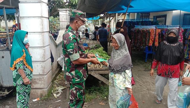 Batu Bara | Dengan penuh semangat dan humanis, senyum dan sapa para Babinsa ini menyapa dan membagikan masker secara cuma-cuma serta melaksanakan edukasi protokol kesehatan kepada para warga masyarakat binaannya, dalam hal ini seperti yang dilakukan oleh Personel Bintara Pembina Desa (Babinsa) Koramil 04/Talawi jajaran Kodim 0208/Asahan Peltu Suriadi, Serma Indra K, Sertu F. Nanda, Sertu Harianto, Sertu N. Prayitno dan Serda Suherman turun kewilayah binaan untuk melaksanakan kegiatan Penegakkan Prokes dan Pembagian Masker Kepada warga, kegiatan tersebut yang dilaksanakan bertempat di Pasar Kemisan Dusun III Desa Karang Baru Kecamatan Datuk Tanah Datar Kabupaten Batu Bara, Kamis (17/02/2022).