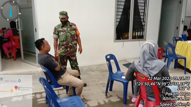 Batu Bara | pengamanan kegiatan penyuntikan vaksin Covid-19 ini untuk memberikan rasa aman dan nyaman, sekaligus monitoring kegiatan tersebut, dalam hal ini seperti yang dilakukan oleh Personel Bintara Pembina Desa (Babinsa) Koramil 01/Medang Deras jajaran Kodim 0208/Asahan Serda Supris Mahadi turun kewilayah binaan untuk melaksanakan kegiatan pengamanan Vaksin di Puskesmas Lalang desa Pakam Raya, serta mengingatkan warga agar selalu mematuhi Protokol kesehatan, kegiatan ini juga turut serta dihadiri oleh Tim Medis Puskesmas, Bapak Rifai dan Ibu Nurainun, kegiatan tersebut yang dilaksanakan bertempat di Desa Pakam Raya Kecamatan Medang Deras Kabupaten Batu Bara, Selasa (22/03/2022).