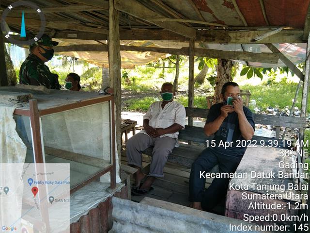 Tanjung Balai  |  Guna untuk memutus mata rantai penyebaran Virus Covid 19 di wilayah Binaan, dalam hal ini Personel Bintara Pembina Desa (Babinsa) Koramil 17/Datuk Bandar jajaran Kodim 0208/Asahan Pelda Herianto turun kewilayah binaan untuk melaksanakan kegiatan pengawasan protokol covid-19 kepada masyarakat dengan memberikan pemahaman New Normal yaitu menggunakan masker setiap keluar rumah, cuci tangan pakai sabun, menjaga jarak dan membagikan masker, kegiatan tersebut yang dilaksanakan bertempat di Jalan Singosari Lingkungan III Kelurahan Gading Kecamatan Datuk Bandar Kota Tanjung Balai, Jumat (15/04/2022).