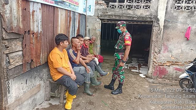 Batu Bara | Guna untuk memutus mata rantai penyebaran Virus Covid 19 di wilayah Binaan serta agar terciptanya silahturahmi yang baik antara TNI dengan masyarakat serta guna memutuskan mata rantai penyebaran Virus Covid-19 sebagai bentuk upaya membantu Pemerintah dalam menegakkan disiplin bagi masyarakat sekitarnya, Personel Bintara Pembina Desa (Babinsa) Koramil 05/Tanjung Tiram jajaran Kodim 0208/Asahan Praka Hudawi turun kewilayah binaan untuk melaksanakan kegiatan Komunikasi Sosial (Komsos) sekaligus melaksanakan kegiatan Penegakan Disiplin Protokol Kesehatan Covid-19 diwarung Bapak Jalil bersama masyarakat Sei Kepayang Tengah, dengan memberikan pemahaman New Normal yaitu menggunakan masker setiap keluar rumah, cuci tangan pakai sabun, menjaga jarak, menghindari kerumunan dan mengurangi mobilitas, dengan turun kewilayah binaan untuk melaksanakan kegiatan Penegakkan Disiplin Protokol Kesehatan dengan memberikan himbauan untuk mematuhi protokol kesehatan dalam pencegahan penyebaran Corona Virus Desease 2019 (Covid-19) bersama dengan Bapak Hasan Basri, Bapak Jefri dan Bapak Anwar, kegiatan tersebut yang dilaksanakan bertempat di Desa Tanjung Tiram Kecamatan Tanjung Tiram Kabupaten Batu Bara, Minggu (15/05/2022).