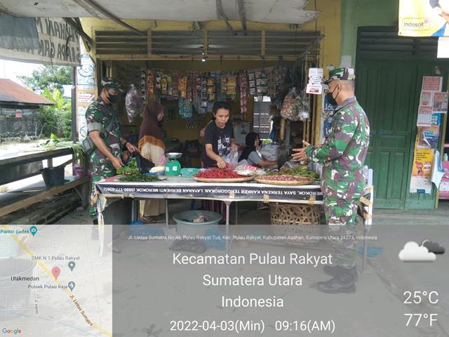 Asahan | Keseharian seorang Babinsa dalam tugas pembinaan teritorial di wilayah desa binaannya adalah menciptakan kedekatan dengan Tokoh Masyarakat dan warga masyarakat binaan, seperti yang dilakukan oleh Personel Bintara Pembina Desa (Babinsa) Koramil 16/Pulau Rakyat jajaran Kodim 0208/Asahan Serda M. Sitorus dan 1 orang anggota turun kewilayah binaan untuk melaksanakan kegiatan Komunikasi Sosial (Komsos) bersama dengan Masyarakat Ibu Hansen Sinaga (warga), Ibu Nur Aida (Warga) dan Ibu Purnama (pemilik kedai) dalam rangka menghimbau warga Dusun 1 Desa Pulau Rakyat Tua agar tetap mematuhi protokol kesehatan pada saat keluar rumah dengan cara tetap menggunakan maskeer, kegiatan tersebut yang dilaksanakan bertempat di Desa Pulau Rakyat Tua Kecamatan Pulau Rakyat Kabupaten Asahan, Minggu (03/04/2022).