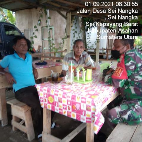 Asahan  |  Agar terjalinnya hubungan yang Harmonis antara Masyarakat Desa Binaan dengan  Babinsa Koramil 10/Sei Kepayang, seperti yang dilakukan oleh Personel Bintara Pembina Desa (Babinsa) Koramil 10/Sei Kepayang jajaran Kodim 0208/Asahan Serda Syahrizal turun kewilayah binaan untuk melaksanakan kegiatan Komunikasi Sosial (Komsos) bersama dengan warga Desa Binaan Desa Sei Nangka Sei Kepayang Barat, kegiatan tersebut yang dilaksanakan berlokasi tepatnya di Dusun 1 Desa Sei Nangka Kecamatan Sei Kepayang Barat Kabupaten Asahan, Rabu (01/09/2021).