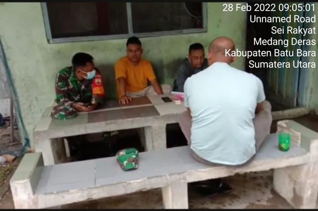 Batu Bara  |  Bagi seorang babinsa kegiatan komunikasi sosial (komsos) selalu di lakukan diwilayah untuk mengetahui kondisi dan situasi yang ada di desa yang menjadi binaannya, dalam hal ini seperti yang dilakukan oleh Personel Bintara Pembina Desa (Babinsa) Koramil 01/Medang Deras jajaran Kodim 0208/Asahan Serda Supriadi turun kewilayah binaan dalam rangka untuk menjalin silaturahmi dalam rangka melaksanakan kegiatan Komunikasi Sosial (Komsos) bersama dengan warga dan mengingatkan warga untuk selalu mematuhi protokol kesehatan dan agar terjalin hubungan silaturahmi yang baik, bersama dengan Bapak Ruslan, Bapak Denny dan Bapak Indra, serta memberikan himbauan kepada masyarakat untuk melakukan Disiplin Protokol Kesehatan, kegiatan tersebut yang dilaksanakan bertempat di Desa Sei Rakyat Kecamatan Medang Deras Kabupaten Batu Bara, Senin (28/02/2022).