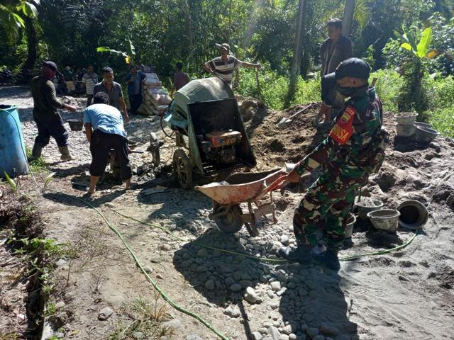 Membangun Bersama Warga, Babinsa Koramil 05/Salapian Kodim 0203/Langkat Kerja Bakti Pengecoran Jalan desa