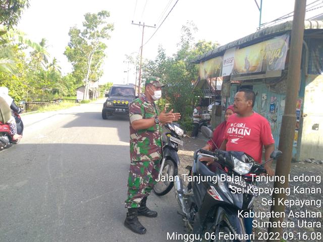 Asahan | Dalam rangka agar terjalinnya hubungan yang baik dan Harmonis antara Babinsa Koramil 10/SK warga masyarakat Desa Sei Kepayang serta untuk mempererat silaturrahim dengan para Tokoh Adat, serta agar terciptanya keharmonisan dan keakrapan antara masyarakat dan TNI diwilayah binaan, Personel Bintara Pembina Desa Koramil 10/Sei Kepayang jajaran Kodim 0208/Asahan Serda Halimat turun langsung ke desa binaan untuk melaksanakan Komunikasi Sosial (Komsos) kepada warga masyarakat desa binaan sekaligus menghimbau Penegakan DIsiplin Protokol Kesehatan (Gakplin Protkes) menghimbau dan mengingatkan kepada warga masyarakat agar selalu menggunakan Masker, rajin mencuci tangan, menjaga Jarak dan menghindari Kerumunan agar terhindar dari Covid 19, khususnya bagi para warga masyarakat agar meningkatkan keamanan Pos Kamling pada malam hari diwilayah tersebut, kegiatan tersebut yang dilaksanakan bertempat di Jalan Lintas Tanjung Balai Tanjung Ledong Dusun II Desa Sei Kepayang Kanan Kecamatan Sei Kepayang Kabupaten Asahan, Minggu (06/02/2022).