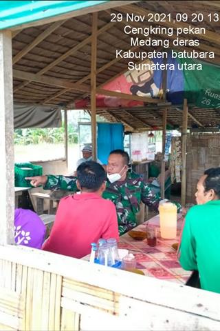 Batu Bara  |  Dalam rangka untuk menciptakan dan meningkatkan kerja sama yang baik, dan menjaga silatuhrahmi antara Babinsa dan Masyarakat serta untuk kemanunggalan TNI dan Rakyat, dalam hal ini Personel Bintara Pembina Desa (Babinsa) Koramil 01/Medang Deras jajaran Kodim 0208/Asahan Peltu Hendryk turun kewilayah binaan untuk melaksanakan kegiatan Komunikasi Sosial (Komsos) bersama dengan mitra karib dan warga desa binaan agar terjalin hubungan silaturahmi yang baik,dan mengingat kan warga agar tetap memakai masker apabila keluar Rumah dalam rangka untuk menghimbau menggunakan masker dengan masyarakat bersama dengan Bapak Sitorus, Bapak Sahlan dan Ibu Nurbaya, kegiatan tersebut yang dilaksanakan bertempat di Desa Cengkring Pekan Kecamatan Medang Deras Kabupaten Batu Bara, Senin (29/11/2021).