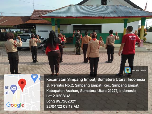 Asahan  |  Salam Pancasila adalah salam kebangsaan, tidak hanya untuk mempersatukan para siswa-siswi atau kelompok tertentu tetapi untuk seluruh masyarakat Indonesia, dalam hal ini seperti yang dilakukan oleh Personel Bibntara Pembina Desa (Babinsa) Koramil 11/Simpang Empat jajaran Kodim 0208/Asahan Serka Sutarno turun kewilayah binaan untuk melaksanakan kegiatan mensosialisasikan Salam Pancasila kepada siswa-siswi SMP Negeri 1 Simpang Empat Kecamatan Simpang Empat Kabupaten Asahan bersama siswa siswi SMP Negeri 1 Simpang Empat yang merupakan Kampung Pancasila di Desa Simpang Empat Kecamatan Simpang Empat Kabupaten Asahan, Jumat (22/04/2022).