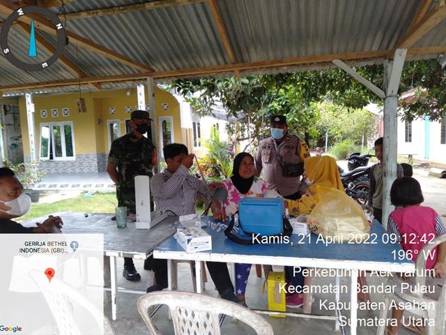 Asahan  |  Sebagai wujud perhatian dan support seorang Atasan adalah wujud perhatian dan dukungannya kepada anggota yang di pimpinnya. Seperti yang di lakukan kali ini oleh Personel Bintara Pembina Desa (Babinsa) Koramil 15/Bandar Pulau jajaran Kodim 0208/Asahan Serda Erianto turun kewilayah binaan untuk turut serta melaksanakan kegiatan kordinasi dan pemantauan pelaksanaan Vaksin kepada warga yang akan melaksanakan vaksin bersama dengan Bapak Deni (Kadus II Desa Perkebunan Aek Tarum), Aiptu Boby (Babinkamtibmas), Ibu dr. Adelina (Kapus Bandar Pulau), Tim Vaksinator Puskesmas Kecamatan Bandar Pulau dan Masyarakat Desa Perkebunan Aek Tarum serta Warga yang di akan di Vaksin, kegiatan tersebut yang dilaksanakan bertempat di Dusun II Perkebunan Aek Tarum Kecamatan Bandar Pulau Kabupaten Asahan, Kamis (21/04/2022).