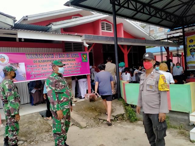 Simalungun | Untuk mencegah penyebaran Covid-19 diwilayah binaan, Pengamanan kegiatan pemberian Vaksin Covid-19 ini, untuk memberikan rasa aman dan nyaman sekaligus monitoring kegiatan tersebut pelaksanaan Vaksin Imunisasi Covid-19, dalam hal ini Personel Bintara Pembina Desa (Babinsa) Koramil 06/Perdagangan jajaran Kodim 0207/Simalungun Serma Sulaiman beserta 2 orang anggota turun kewilayah binaan untuk turut serta melaksanakan kegiatan monitoring pelaksanaan Gebyar Vaksinasi Tahap ke I kepada Ibu Hamil, kegiatan tersebut yang dilaksanakan bertempat di Puskesmas Perdagangan Kecamatan Bandar Kabupaten Simalungun, Rabu (01/09/2021).