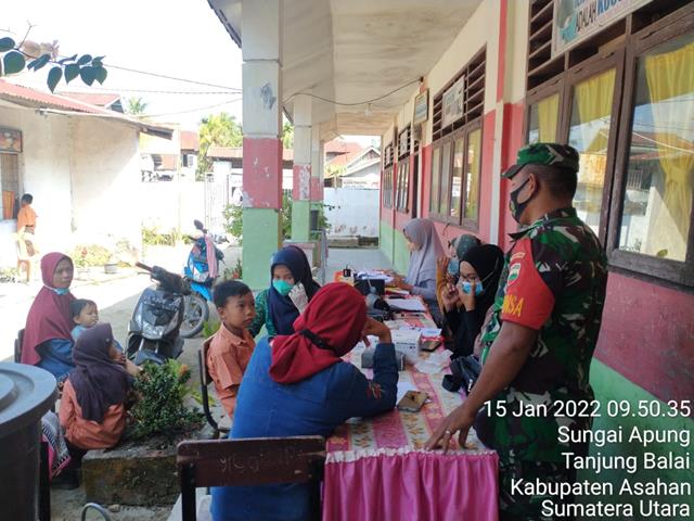 Asahan  |  Guna menyukseskan vaksinasi diwilayah desa binaan, dalam hal ini Personel Bintara Pembina Desa (Babinsa) Koramil 08/Pulau Buaya jajaran Kodim 0207/Simalungun Praka Fadli Siagian turun kewilayah binaan untuk melaksanakan kegiatan pendampingan Serbuan Vaksinasi Usia 6 sampai dengan 12 Tahun kepada para Siswa-siswi SD Negeri 010006 diwilayah binaan bersama dengan Ibu Dokter Susi, Ibu Nana (Kepala Sekolah) dan Siswa siswi Vaksinasi, kegiatan tersebut yang dilaksanakan bertempat di SD Negeri 010006 Desa Sei Apung Kecamatan Tanjung Balai Kabupaten Asahan, Sabtu (15/01/2022).