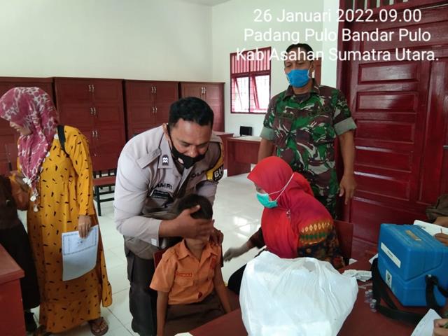 Asahan | Guna menyukseskan vaksinasi diwilayah desa binaan, dalam hal ini seperti halnya yang dilakukan oleh Personel Bintara Pembina Desa (Babinsa) Koramil 15/Bandar Pulau jajaran Kodim 0208/Asahan Sertu Eddy Admojo turun kewilayah binaan untuk melaksanakan kegiatan pendampingan Serbuan Vaksinasi Usia 6 sampai dengan 12 Tahun kepada para Siswa-siswi SD Negeri 016556 diwilayah binaan bersama dengan Tim Vaksinator Puskesmas Bandarpulo, Anggota Polsek Bandar Pulo dan Orang tua wali para siswa siswi SDN 016556 Dusun 5 Desa Padang Pulo dengan memberikan himbauan agar para siswa siswi tidak perlutakut dalam pelaksanaan vaksin dan vaksin itu perlu untuk kekebalan tubuh, kegiatan tersebut yang dilaksanakan bertempat di Dusun 5 Desa Padang Pulo Kecamatan Bandar Pulo Kabupaten Asahan, Rabu (26/01/2022).
