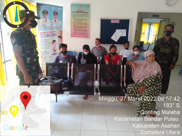 Asahan | Untuk mencegah penyebaran Covid-19 diwilayah binaan, Pengamanan kegiatan pemberian Vaksin Covid-19 ini, untuk memberikan rasa aman dan nyaman sekaligus monitoring kegiatan tersebut pelaksanaan Vaksin Imunisasi Covid-19, dalam hal ini Personel Bintara Pembina Desa (Babinsa) Koramil 15/Bandar Pulau jajaran Kodim 0208/Asahan Serda Erianto turun kewilayah binaan untuk turut serta melaksanakan kegiatan monitoring pelaksanaan Vaksinasi, kegiatan tersebut yang dilaksanakan bertempat di Puskesmas Gunting Malaha Kecamatan Bandar Pulau Kabupaten Asahan, Minggu (27/03/2022).