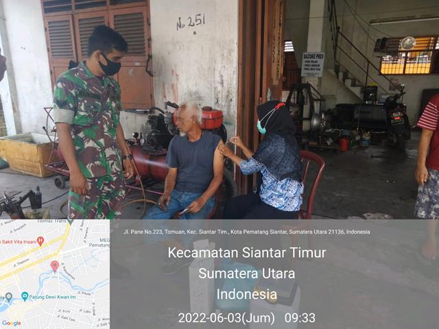 Dengan turun kewilayah binaan untuk melaksanakan kegiatan pendampingan Vaksinasi kepada masyarakat, kegiatan tersebut yang dilaksanakan berdampingan dengan di dua wilayah pada wilayah Koramil 02/Siantar Timur, pada serbuan Vaksinasi yang dilaksanakan hari ini kepada warga masyarakat adalah Vaksin Dosis l, ll dan lll (Booster), kegiatan tersebut diberikan kepada seluruh warga masyarakat baik anak usia 6-11, Dewasa sampai dengan Lansia dengan tujuan untuk kekebalan imunitas tubuh, baik perorangan maupun kelompok lingkup tingkat RT/RW dan Kelurahan, terang Babinsa Serka B Panjaitan.
