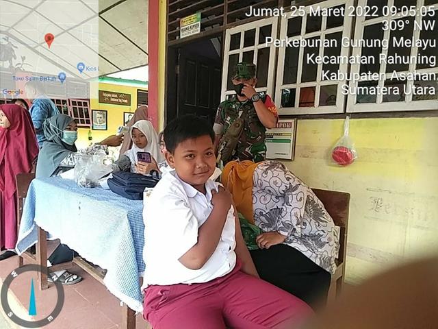 Asahan | Guna menyukseskan vaksinasi diwilayah desa binaan, dalam hal ini Personel Bintara Pembina Desa (Babinsa) Koramil 15/Bandar Pulau jajaran Kodim 0208/Asahan Sertu Aprianto turun kewilayah binaan untuk melaksanakan kegiatan pendampingan Serbuan Vaksinasi Usia 6 sampai dengan 12 Tahun Dosis k ell kepada para Siswa-siswi SD diwilayah binaan dan Penerima Bantuan Program Indonesia Pintar (PIP) Siswa/siswi SD Negeri 010140 Perk. Gunung Melayu, yang turut serta dihadiri oleh Guru-guru SD Negeri 010140, Tim Vaksinasi Puskesmas Rahunig dan Siswa/wi SDN 010140 Perk.Gunung Melayu yang akan di Vaksin, kegiatan tersebut yang dilaksanakan bertempat di SD Negeri 010140 Desa Perk Gunung Melayu Kecamatan Rahuning Kabupaten Asahan, Jumat (25/03/2022).