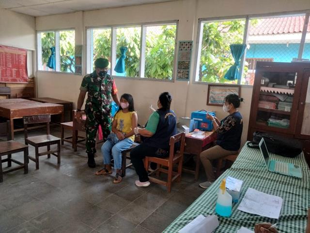 Simalungun | Vaksinasi Covid 19 yang kali ini diprioritaskan bagi anak usia dini usia 6-11 tahun.Kehadiran kami untuk memantau ketertiban terutama ketertiban protokol kesehatan saat proses vaksinasi berjalan, seperti halnya yang dilakukan oleh Personel Bintara Pembina Desa (Babinsa) Koramil 08/Bangun jajaran Kodim 0207/Simalungun Sertu Jasa Sembiring turun kewilayah binaan untuk melaksanakan kegiatan monitoring/pendampingan pelaksanaan percepatan Vaksinasi bagi anak anak umur 6-11 tahun warga Nagori Lestari Indah dan Nagori Sitalasari Kecamatan Siantar Kabupaten Simalungun, kegiatan tersebut yang dilaksanakan bertempat di Gedung SD Negeri 098166 Kecamatan Siantar Kabupaten Simalungun, Sabtu (08/01/2022).