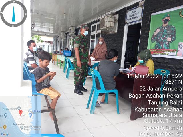 Asahan  |  Dalam rangka kegiatan Vaksinasi Covid-19 Dosis l, ll dan lll Booster terus dilakukan pengamanan secara bertahap, dalam hal ini seperti yang dilakukan oleh Personel Bintara Pembina Desa (Babinsa) Koramil 08/Pulau Buaya jajaran Kodim 0208/Asahan Sertu Suwardi turun kewilayah binaan untuk melaksanakan kegiatan pendampingan Vaksinasi Dosis l, ll dan lll Booster untuk Masyarakat umum agar tercapainya masyarakat yang sehat terhindar dari Covid 19 serta selalu mematuhi Protokol Kesehatan, dalam kegiatan tersebut turut serta dihadirioleh dr. Surya (Kapus Bagan), Ibu fika (Vaksinator) dan Ibu sagala (Vaksinator) kegiatan tersebut yang dilaksanakan bertempat di Puskesmas Bagan Asahan Kecamatan Tanjung Balai Kabupaten Asahan, Jumat (11/03/2022).