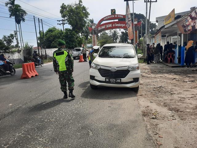 Simalungun | Dalam upaya pencegahan penyebaran virus Covid 19, petugas gabungan menggelar operasi yustisi dan penegakan disiplin protokol kesehatan (prokes). dalam rangka pemberlakuan pembatasan kegiatan masyarakat (PPKM) Skala Mikro. Seperti halnya yang dilakukan oleh Personel Bintara Pembina Desa (Babinsa) Koramil 19/Negeri Dolok jajaran Kodim 0207/Simalungun Pelda Sugianto turun kewilayah untuk melaksanakan kegiatan Pos Penyekatan dalam rangka Pelaksanaan PPKM Level lV dalam rangka penanganan virus corona (Covid-19) diwilayah Kabupaten Simalungun, kegiatan tersebut yang dilaksanakan bertempat di Pos Penyekatan Perbatasan Kabupaten Simalungun-Pematang Siantar dan melaksanakan PPKM Level IV di Simpang Sambo Kabupaten Simalungun, Minggu (05/09/2021).