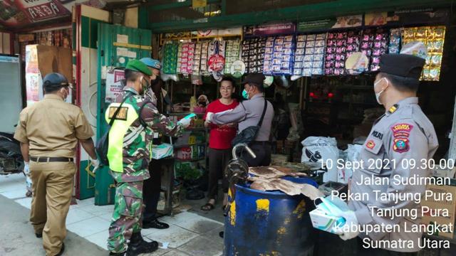 Tanjung Pura -Demi menekan perkembangan covid 19, Babinsa Koramil 11/Tanjung Pura jajaran kodim 0203/Langkat Serda Awaludin beserta personil Polsek dan aparat desa melaksanakan kegiatan Protokol Kesehatan serta membagikan masker bertempat di Jl. Sudirman Kelurahan Pekan Kecamatan Tanjung Pura Kabupaten Langkat,Sabtu (11/09/2021)
