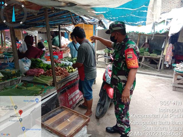 Batu Bara | Dengan melaksanakan Pam Disiplin Mandiri Covid-19 di Pasar Delima Indrapura dengan menghimbau kepada para pedagang dan pembeli agar selalu mencuci tangan dengan sabun, menggunakan masker dan menjaga jarak serta menghindari kerumunan guna mencegah penularan Covid-19, seperti halnya yang dilakukan oleh Personel Bintara Pembina Desa (Babinsa) Koramil 02/Air Putih jajaran Kodim 0208/Asahan Serka L. Marpaung dan Serda Anwar Sadat turun kewilayah binaan untuk Pam Disiplin Mandiri Covid-19 di Pasar Delima Indrapura dengan menghimbau kepada para pedagang dan pembeli agar selalu menggunakan masker dan menjaga jarak serta menghindari kerumunan guna mencegah penularan Covid-19. Giat tersebut berlokasi di Pasar Delima, Kelurahan Indrapura, Kecamatan Air Putih, Kabupaten Batu Bara, Selasa (22/03/2022).