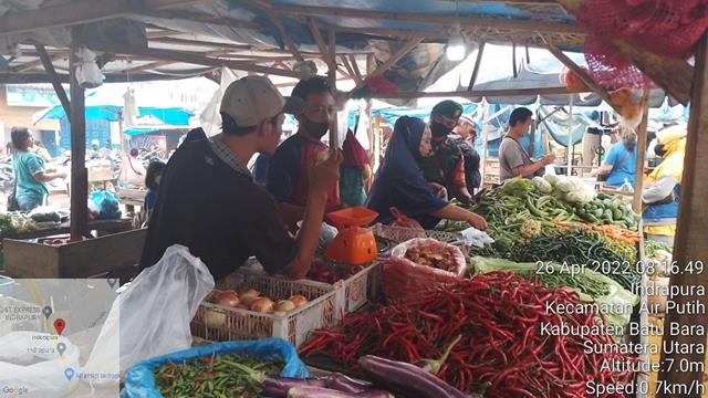 Batu Bara  |  Agar para pedagang dan pembeli didiplin dalam menerapkan protokol kesehatan untuk mencegah penularan Virus Corona atau Covid-19, seperti yang dilakukan Personel Bintara Pembina Desa (Babinsa) Koramil 02/Air Putih jajaran Kodim 0208/Asahan Serda Supardi dan Serda Indra turun kewilayah binaan untuk melaksanakan kegiatan Pam Disiplin Mandiri Covid-19 di Pasar Delima Indrapura dengan menghimbau kepada para pedagang dan pembeli agar selalu mencuci tangan dgn sabun, menggunakan masker dan menjaga jarak serta menghindari kerumunan guna mencegah penularan Covid-19, kegiatan terserbut yang dilaksanakan bertempat di Pasar Delima Kelurahan Indrapura Kecamatan Air Putih Kabupaten Batu Bara, Selasa (26/04/2022).