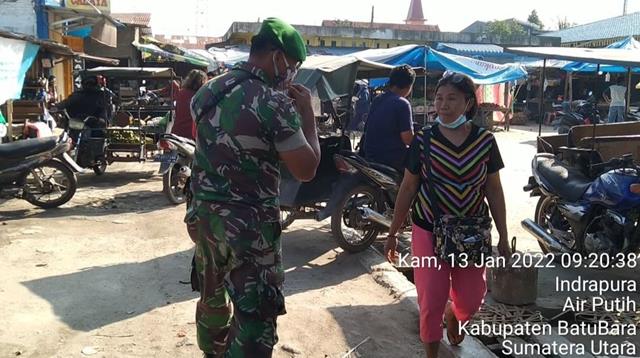 Batu Bara | Dalam rangka untuk memutus mata rantai penyebaran covid-19 diwilayah binaan salah satunya ditempat keramaian (Pasar Tradisional), dalam hal ini Para pedagang dan pembeli merasa senang dengan adanya himbauan dari Babinsa, seperti yang dilaukan oleh Personel Bintara Pembina Desa (Babinsa) Koramil 02/Air Putih jajaran Kodim 0208/Asahan Serda Ngatiran dan Kopda Tampubolon turun kewilayah binaan untuk melaksanakan Pam Disiplin Mandiri Covid-19 di Pasar Delima Indrapura dengan menghimbau kepada para pedagang dan pembeli agar selalu mencuci tangan dgn sabun, menggunakan masker dan menjaga jarak serta menghindari kerumunan guna mencegah penularan Covid-19, kegiatan tersebut yang dilaksanakan bertempat di Pasar Delima Kelurahan Indrapura Kecamatan Air Putih Kabupaten Batu Bara, Kamis (13/01/2022).