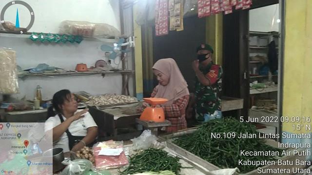 Dalam menekan angka penularan Covid-19 di Wilayah Koramil 02/Air Putih, Babinsa Sertu David Purba melakukan pemantauan di Pasar Delima Indrapura Kecamatan Air Putih. Dalam kegiatan tersebut Babinsa Sertu David Purba dalam rangka membantu pemerintah dalam mensosialisasikan kepada masyarakat agar senantiasa penuh dengan kesadaran dan kedisiplinan terhadap penerapan protokol kesehatan guna terus mencegah dan memutuskan mata rantai penyebaran Covid-19.
