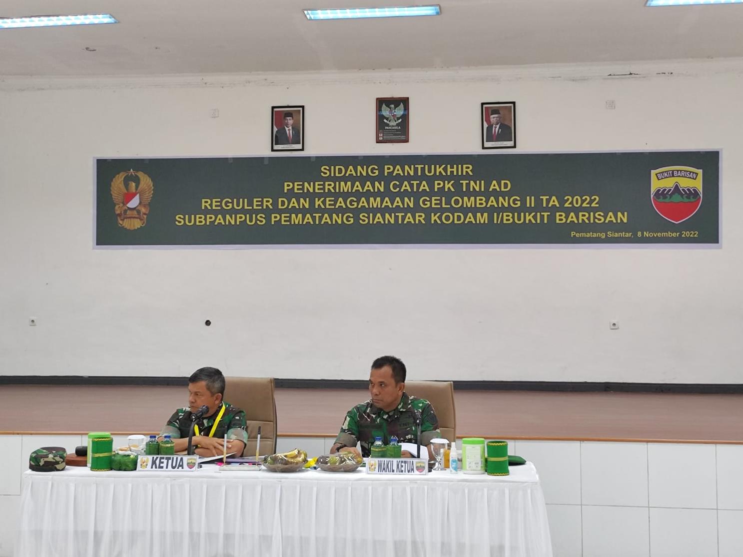 Pematangsiantar – Panglima Komando Daerah Militer I/ Bukit Barisan Mayjen TNI Achmad Daniel Chardin SE, MSi, memimpin sidang Pantukhir Penerimaan Cata PK TNI AD Reguler dan Keagamaan Gelombang II Ta 2022 Subpanpus Pematang Siantar Kodam I/Bukit Barisan di Mako Rindam I/BB Jl. Arga Sari, Pematangsiantar, Sumatera Utara, Selasa (08/11/2022).