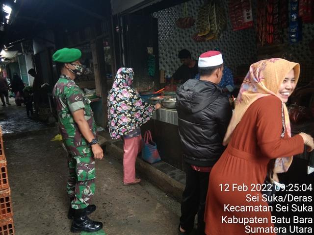Batu Bara | Aktivitas masyarakat di pasar tradisional menjadi perhatian dari tim gabungan satgas penanganan Covid-19 di daerah, dengan melaksanakan patroli disiplin mandiri covid 19 dipasar delima indrapura menghimbau kepada pedagang dan pembeli agar tetap menggunakan masker dan menjaga jarak serta tidak lupa mencuci tangan guna memutuskan penyebaran Covid-19. Seperti halnya yang dilakukan oleh Personel Bintara Pembina Desa (Babinsa) Koramil 02/Air Putih jajaran Kodim 0208/Asahan Sertu Sumedi dan Serda Wardoyo melaksanakan Pam Disiplin Mandiri Covid-19 di Pasar Delima Indrapura dengan menghimbau kepada para pedagang dan pembeli agar selalu mencuci tangan dengan sabun, menggunakan masker dan menjaga jarak serta menghindari kerumunan guna mencegah penularan Covid-19. Kegiatan tersebut bertempat di Pasar Delima, Kelurahan Indrapura, Kecamatan Air Putih, Kabupaten Batubara, Sabtu (12/02/2022).